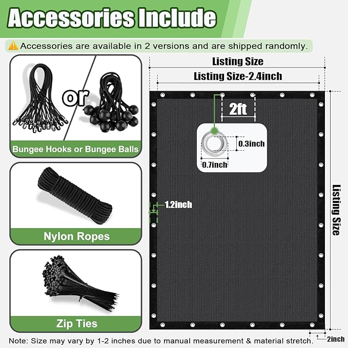 - [Easy Installation with Accessories] Heavy duty Stainless steel grommets are installed every 2' on each side, and the included nylon ropes, bungee hooks (or bungee balls, depending on the product version), zip tie make installation even more flexible and easy for one person.