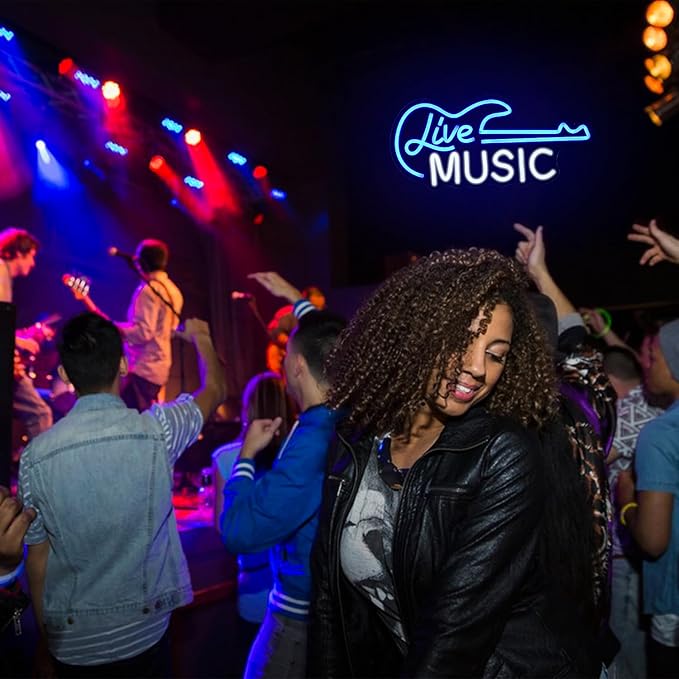 - Guitar Live Music Neon Sign:White Blue NEON LIGHT with a guitar shape and live music letters on it that has different colors for each shape. It's quite simply a plug and play and personally got it for a music area and it will help add to the aesthetic.