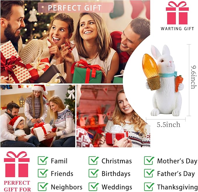- 【Beautiful Home Garden Decor and Great Gifts】The Rabbit with Solar Lantern Statue is not only the best gift for any occasion such as birthday, Christmas, Mother's Day or Father's Day, Easter, Thanksgiving, weddings, Valentine's Day, New Year's, graduation, etc. It can be given to Rabbit lovers, animal lovers, lovers, husbands, wives, mothers, fathers, sons, daughters, etc.