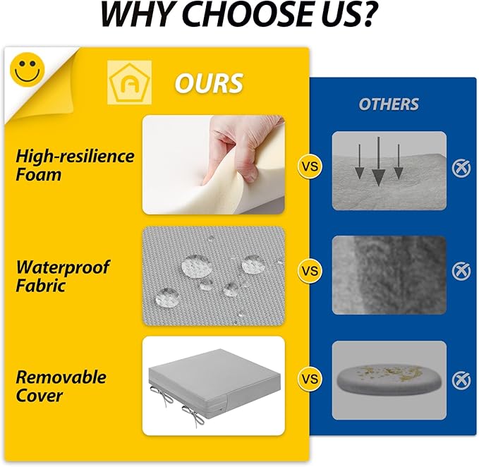 - Wide Use & Tips: These outdoor dining chair cushions fit pools, patios, balconies, decks, backyards, and gazebos. Foam inserts and covers are packed separately in bags and placed in one box—check all parts. Easy assembly required