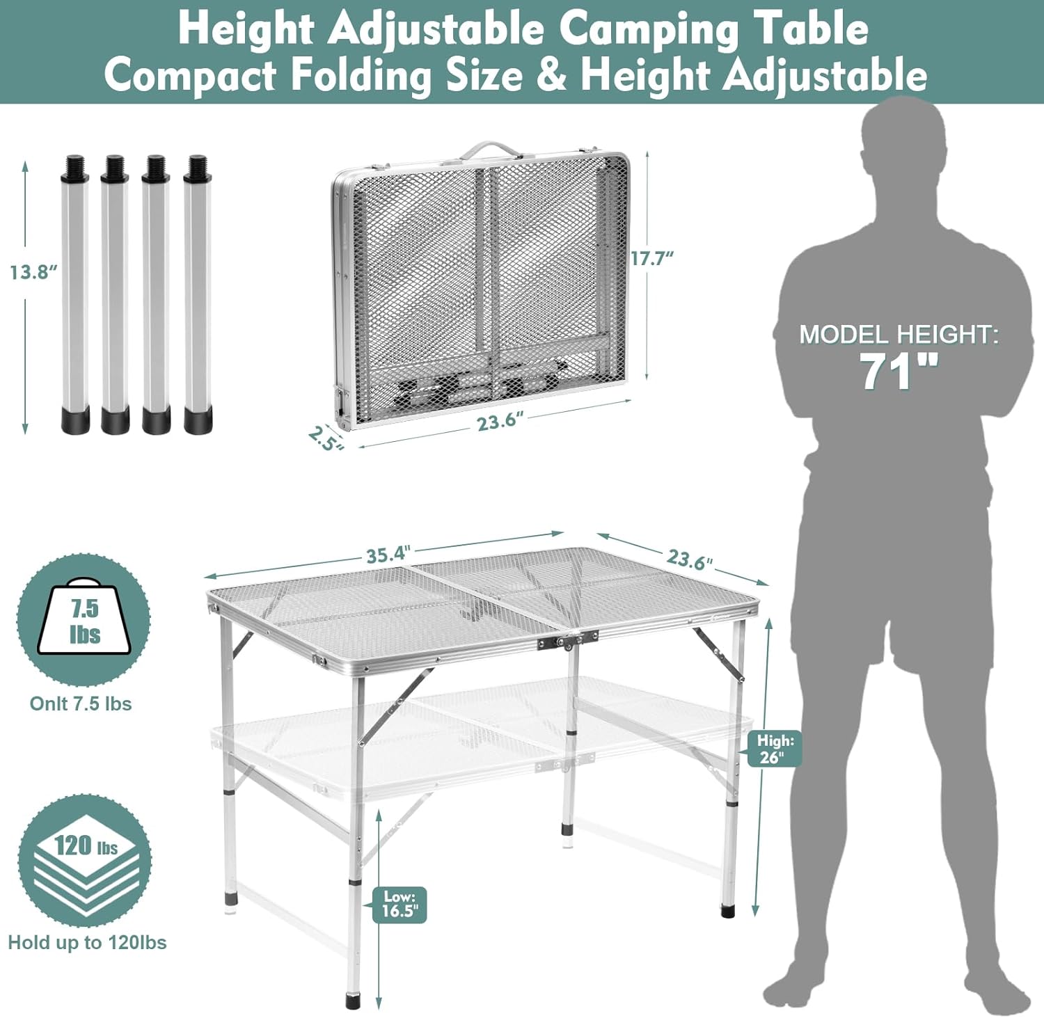 - [Adjustable Grill Table]The folding camping table allows you to adjust the height of the camping table from an initial height of 16.5 inches to a height of 22 inches,providing a perfect surface for you to picnic on the grass or grill standing up