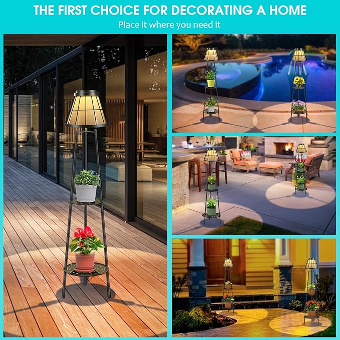 - Innovative Solar Street Light:Unlike traditional solar floor lamps, our 45.5-inch solar pathway light features a groundbreaking double-tier plant shelf concept. This innovative design allows you to display your favorite plants or books, tools, etc. to add a refreshing touch of nature or culture to your outdoor garden, yard, patio.