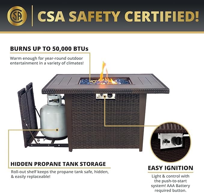 - 【Certified Safe & Ease of Use】Peace of mind comes standard with CSA certification for safe residential and commercial enjoyment. The convenient push-button ignition offers effortless lighting, while the discreet tank holder ensures your space remains neat and organized. Dimensions: 42” L x 42” W x 25'' H