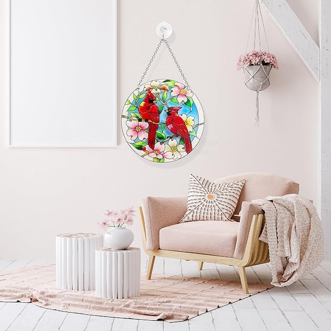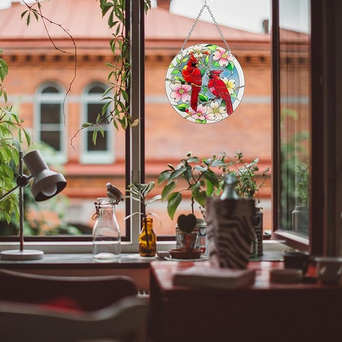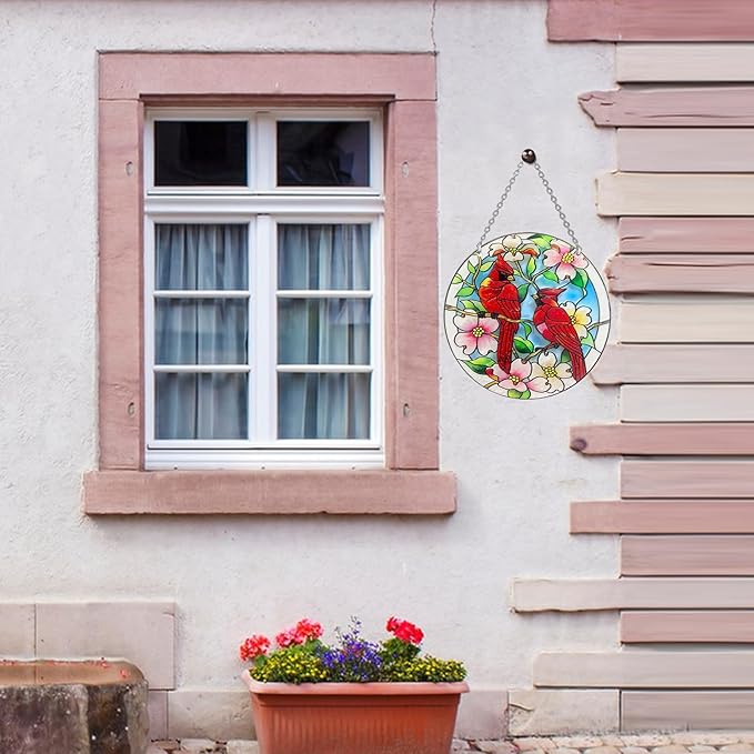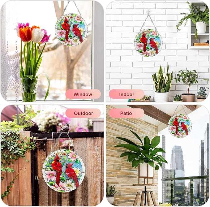 - Larger Size Cardinal Suncatcher - Based on the first generation of 6-inch Cardinal bird stained glass, the second generation uses professional American stained glass, and has been upgraded to 8.6 inches, which is more suitable for every scene you need, including living room, bedroom, outdoor garden, etc. (An adhesive backed hanger is Provided)