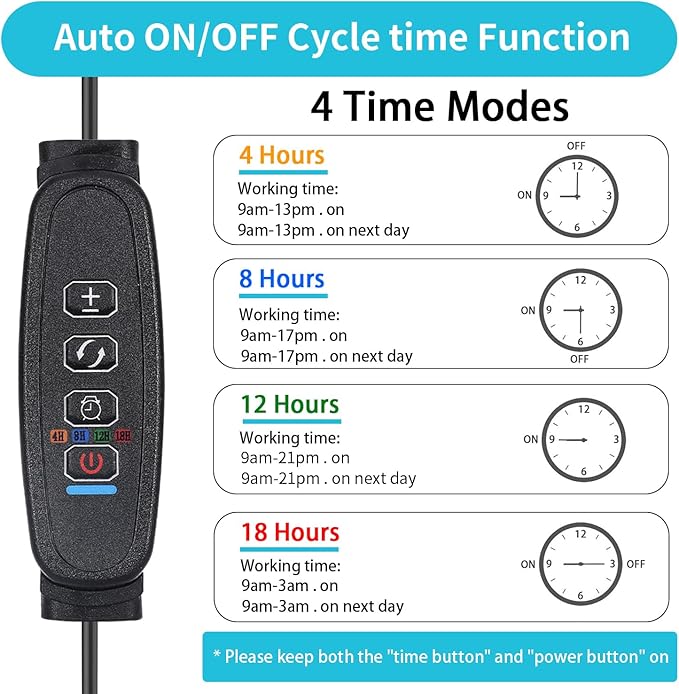 - 【Auto On/Off Timing Function】The plant grow light comes with a cycle memory timer function, which can Auto turn on/off every day according to your settings: 4/8/12/16 hours, the grow light will Auto turn on and off at the same time the next day, no manual operation is required, you can take care of your plants when you on work or vacation.