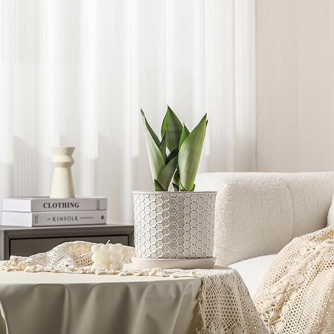 8 Inch Plant Pot: Ceramic Planter with Drainage Hole & Saucer - Flowerpot for Indoor & Outdoor Plants with Separate Tray for Home & Office - Honeycomb Design, Cream White