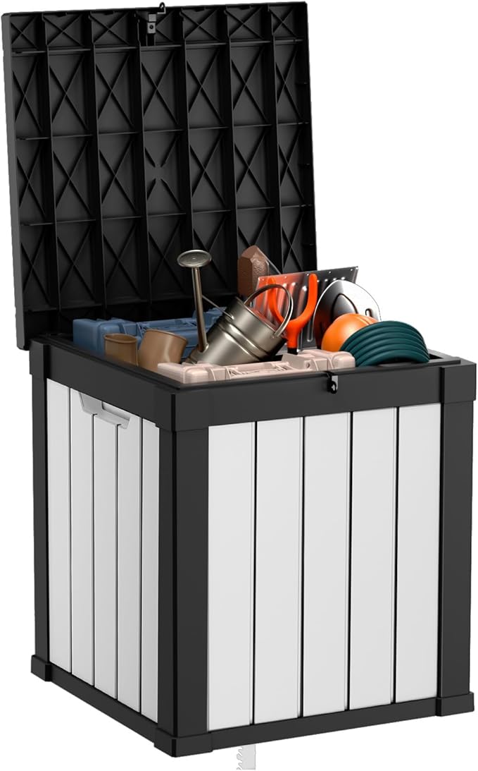 40 Gallon Resin Deck Box, Lockable Patio Outdoor Storage Box for Furniture, Garden Tools and Tools Storage, Waterproof Outside Storage Boxes - Black&White