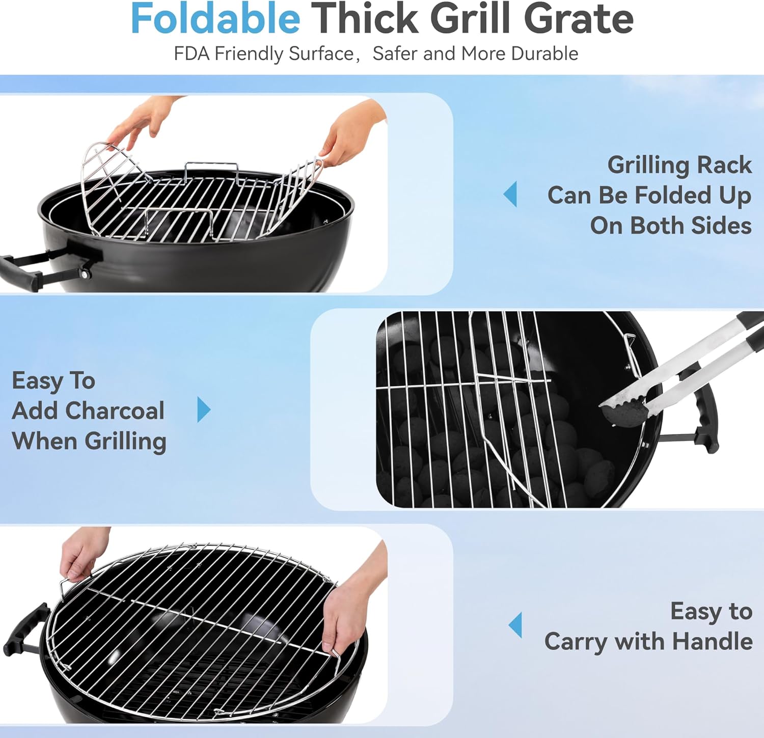 - FOLDABLE GRILL GRATE: Flip-up sides allow easy addition of briquettes. And grates have curved hand grips