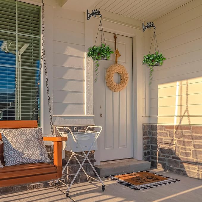 - DURABLE AND ANTI-RUST - Crafted from heavy-duty iron, our 10-inch hanging plant bracket features an 2 mm thick body and 2 cm wide base to ensure no deformation even with heavy flower pots in windy conditions (max load 30 lb). The anti-rust coating ensures long-lasting durability, making it ideal for both window plant hanger indoor and plant hangers outdoor.