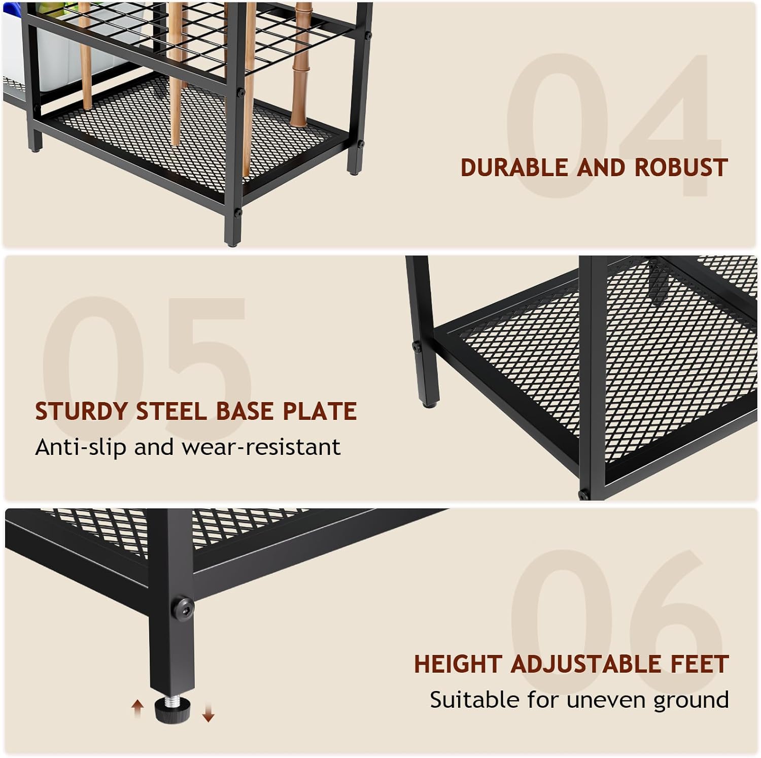 - 【Keep it tight, no more falling】: Paralleled up-down slots help keep sticks straight, ensuring most of your garden equipment remains in one spot without falling over. The bottom flow-through grate prevents standing water.