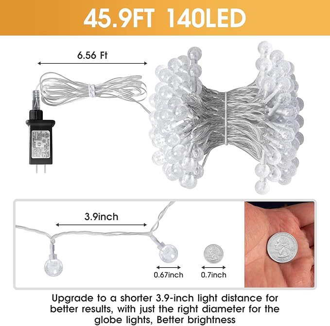 - Commercial quality string lights: The globe around the lights are shatterproof because they are made out of plastic. 140 led bulbs give off a warm white light. An ul listed power adapter comes with the lights,and the spacinga between bulbs is 3.94 inches