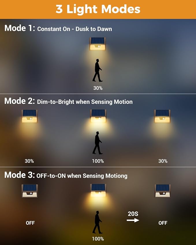 - Smart PIR Motion Inductor: vighep solar lights outdoor offer 3 lighting modes for versatile functionality. 1. Motion Sensor Mode: Lights turn on when people approach, ensuring safety and convenience. 2. Permanent On Mode: Lights stay illuminated all night for continuous visibility. 3. Smart Brightness Control: Lights stay on all night and automatically brighten when motion is detected, optimizing energy efficiency and enhancing security.