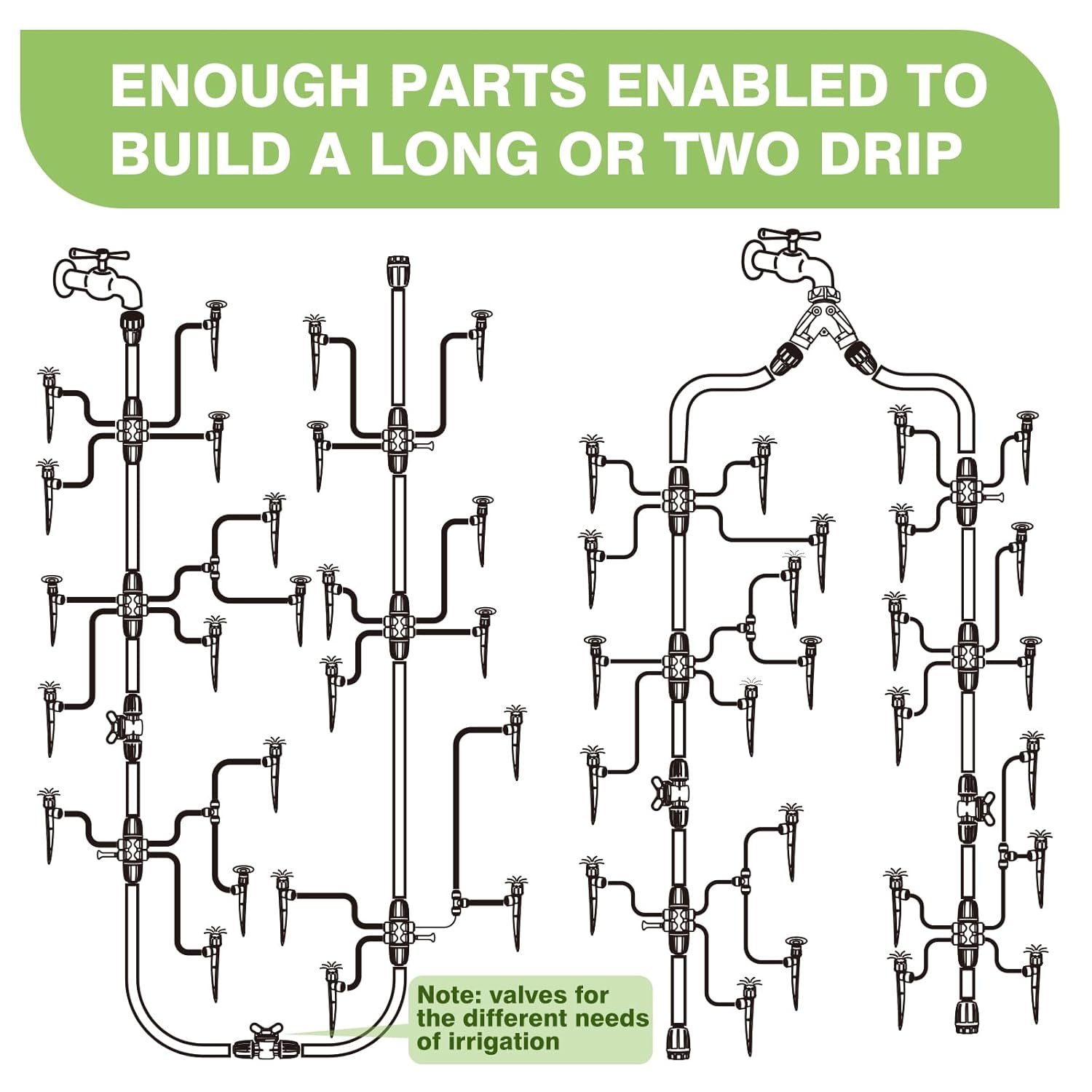 - Enhanced Tubing Design: Our main tubing has been upgraded to withstand higher water pressure, ensuring durability and reliability. With a generous 40FT length, which can be easily divided into two main tubes, and two faucet connectors included, setting up multiple drip irrigation systems is a breeze.
