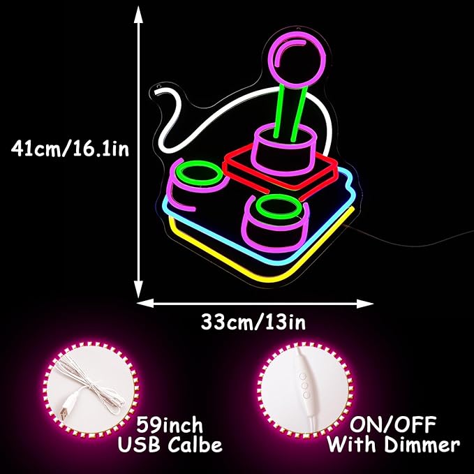 - Safe Material:colorful retro joystick led neon sign made of LED tube technology and silicone tubes and strong and transparent acrylic,game neon lights signs size is 16"x13"(41*31cm),game room decor light up your bedroom,add romantic for wall decoration!
