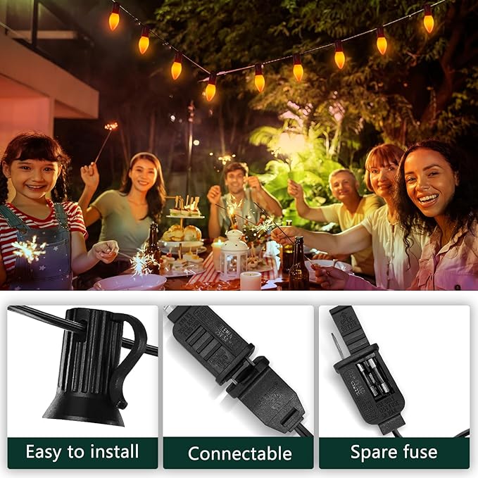 - Safety-Assured Halloween Lighting:Ensure reliable and safe Halloween illumination with C9 LED orange bulb lights. With a 6" lead featuring a male plug, 12" spacing between bulbs, and a 6" tail with a female connector, they come equipped with built-in UL-listed fuse protection. If one bulb goes out, the others will remain lit, and an extra fuse is provided for your peace of mind.