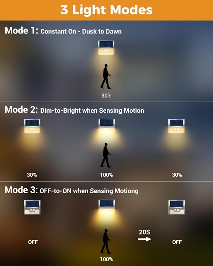 - Smart PIR Motion Inductor: vighep solar lights outdoor offer 3 lighting modes for versatile functionality. 1. Motion Sensor Mode: Lights turn on when people approach, ensuring safety and convenience. 2. Permanent On Mode: Lights stay illuminated all night for continuous visibility. 3. Smart Brightness Control: Lights stay on all night and automatically brighten when motion is detected, optimizing energy efficiency and enhancing security.