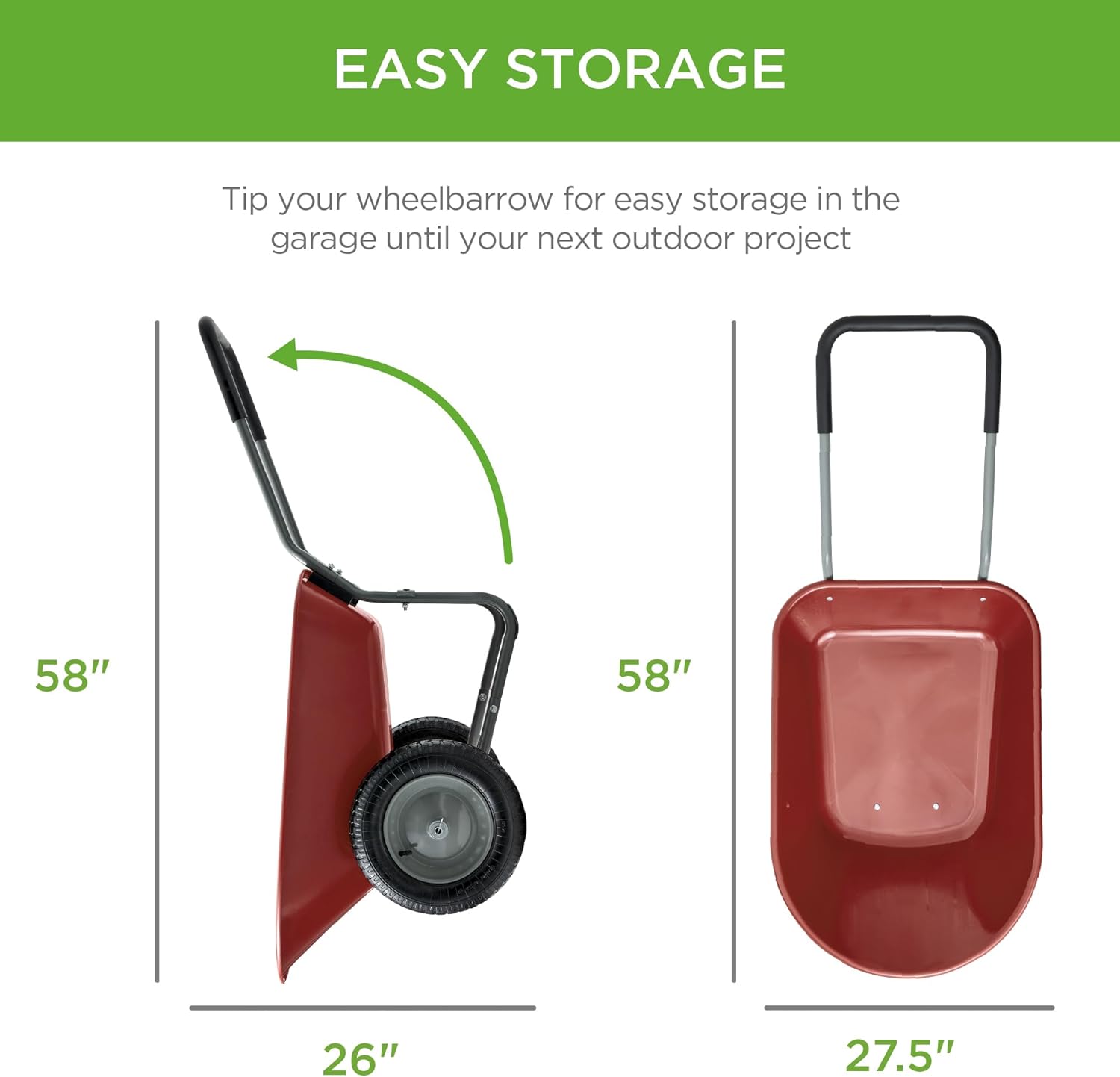 - EASY STORAGE: A compact profile combined with easy tipping action allows you to seamlessly store this wheelbarrow upright in your garage or garden shed; OVERALL DIMENSIONS: 58"(L) x 27.5"(W) x 26"(H); Weight Capacity: 330 lbs.