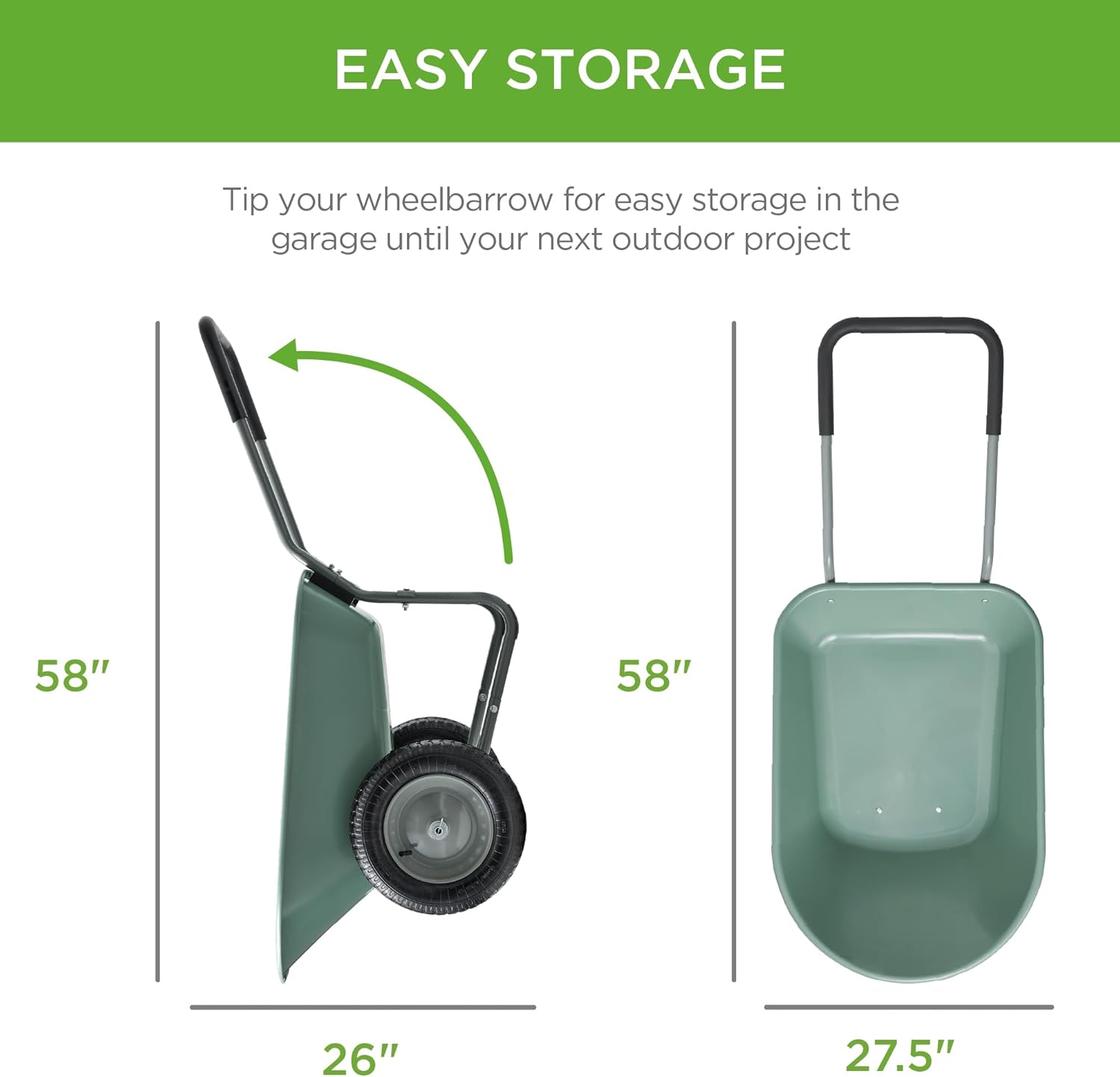- EASY STORAGE: A compact profile combined with easy tipping action allows you to seamlessly store this wheelbarrow upright in your garage or garden shed; OVERALL DIMENSIONS: 58"(L) x 27.5"(W) x 26"(H); Weight Capacity: 330 lbs.