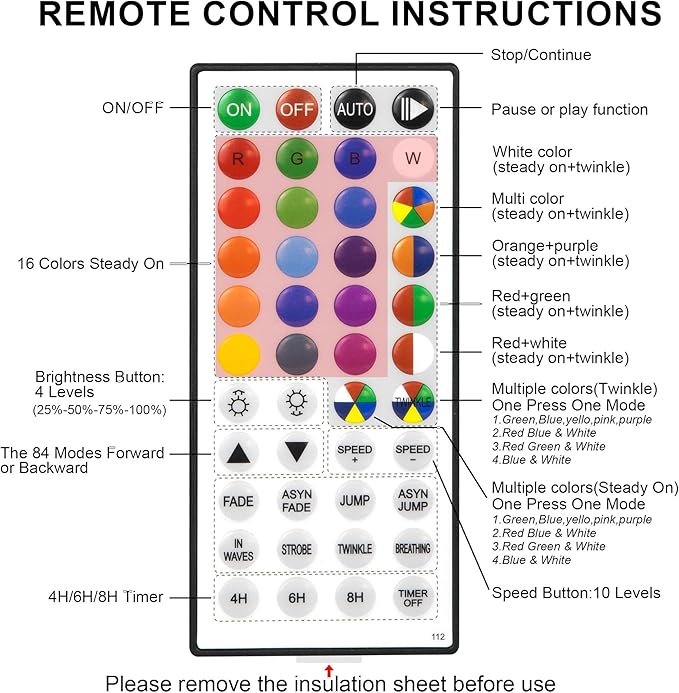 - Remote Control : Use the included 32-button wireless remote control to easily select different colors, choose from 8 lighting modes for each color, adjust speed and brightness, and set a timer (4/6/8 hours). Our user-friendly remote control is designed to be clear, intuitive and eye-catching. To use the remote control, remove the insulating tab in the remote control and align it with the controller box.