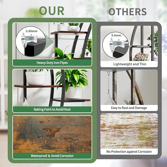 - 【High-Quality Material & Sturdiness】This plant holder is made with a sturdy 0.8mm thick iron pipe frame, with high-quality 15mm thick particleboard shelves, ensuring both durability and stability. The iron pipes are coated with special paint to prevent rust, while the shelves are treated with a water-resistant coating, allowing you to easily wipe away any water without damage.