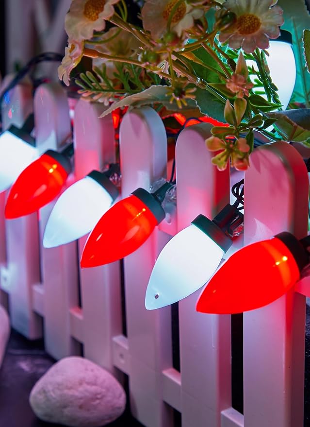 - 【 Outdoor Rated Smooth Opaque Bulbs 】 - These light strings are equipped with large smooth opaque C9 bulbs, producing amazingly saturated color from base to tip for the vintage classic holiday bulb look. Built-in SMD LED creates vivid lighting effects. The bulbs, with their vibrant colors, are designed to resist fading, chipping, and cracking