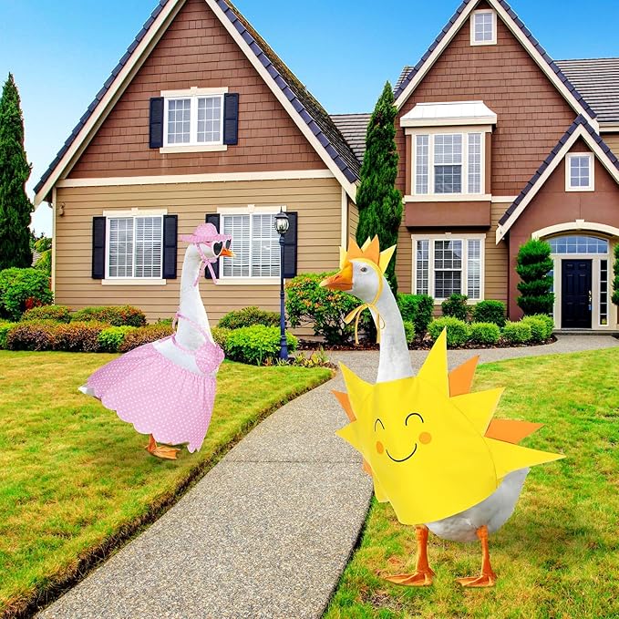 - Aesthetic and Stylish: featuring a delightful summer design in vibrant colors of yellow and pink, the goose outfits for cement goose will draw attention and add a visually appealing detail to your lawn or garden; Dressing up your goose transforms ordinary lawn fixtures into eye catching garden centerpieces