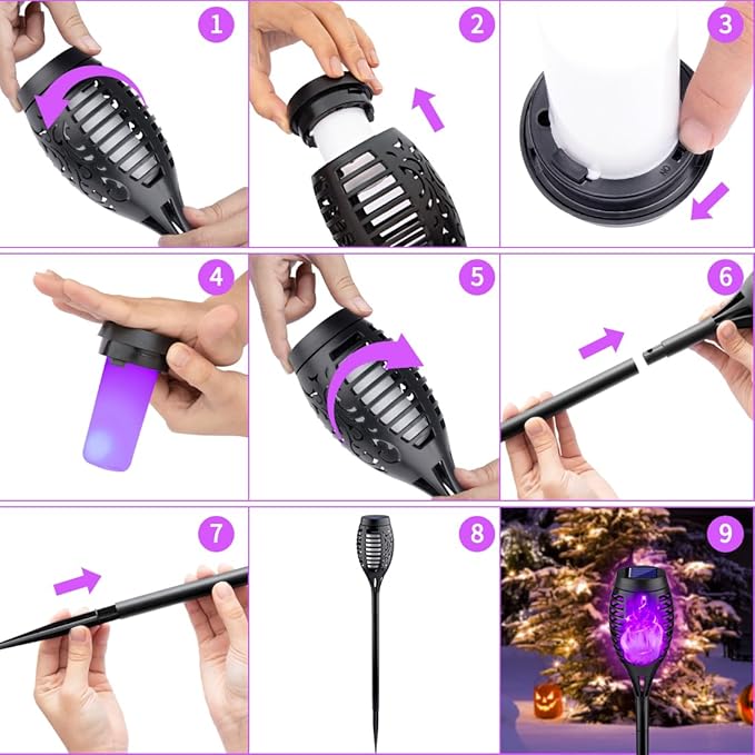 - Halloween Decorations Use Tips: These are 8Pack purple solar halloween lights in package. Any lack of spike or solar torch lights, please contact us via amazon. Please read instruction manual carefully before using halloween yard lights.