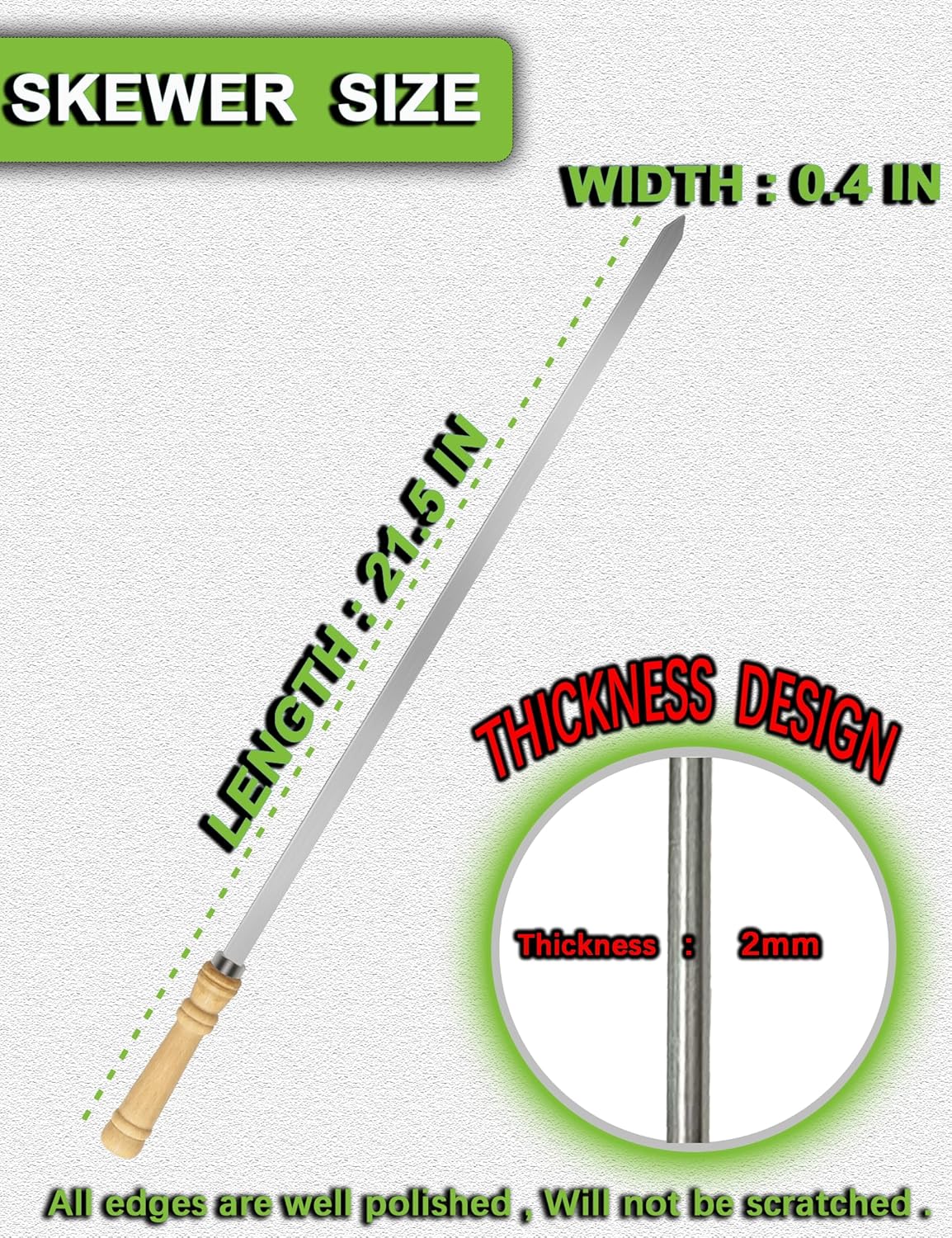 - 【FOOD GRADE 304 STAINLESS STEEL】JOWHONK BBQ skewers for grilling are 21.5 inches long,0.4 in width,0.07 in thickness. Our wooden handle flat metal skewers for kabobs are made of premium 304 stainless steel, Ensuring non-rust long time durability, Heat resistant and non-poisonous,Harder than other stainless steel and iron.It's safety for children.Our Stainless steel Barbecue skewers are reusable. The BBQ kabob skewers surface is smooth that grilled food residue won't get stuck onto the kabob skewer blade.