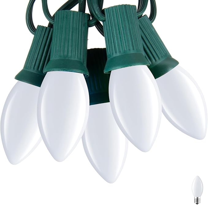 - C7 Vintage Christmas Lights : 25FT outdoor Christmas hanging string Lights with 26 colored bulbs(1 spare), E12/C7 candelabra base, each bulb is 0.6W/120V, colorful light emanates from the bulbs to create a retro and cheerful atmosphere, and it doesn't affect the other bulbs to light up if one bulb doesn't light up