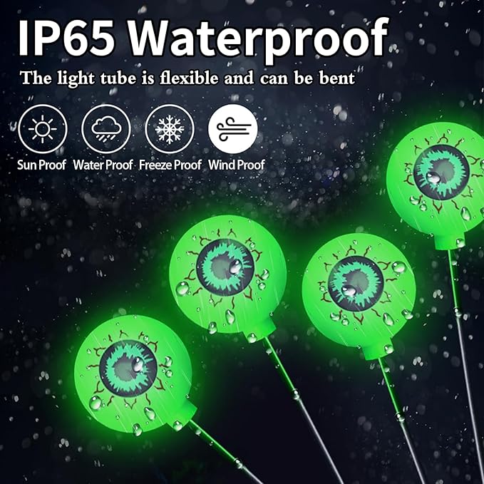 - [Vivid & Scary Design]:With a 3D design and swaying eyeballs that appear more three-dimensional and realistic,these lights feature the perfect combination of bloodshot eyes and eerie green light, making your yard the most mysterious and terrifying presence on Halloween night