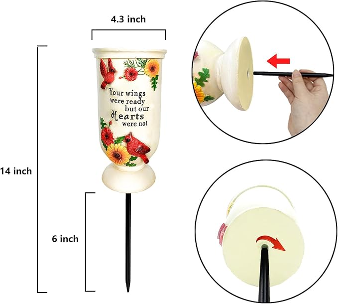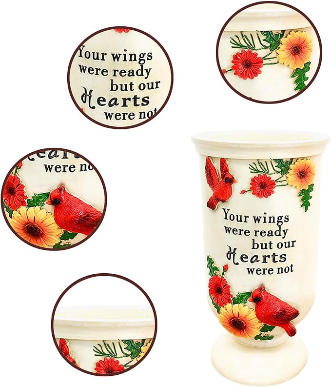 - Cemetery Flowers Vases: Cemetery decorations for grave are lovely way to honor a loved one. The lovely sentiment reads, “Your wings were ready but our hearts were not” The design of the cardinal creates a beautiful, uplifting element. Commemorate your lover with our sympathy gift!