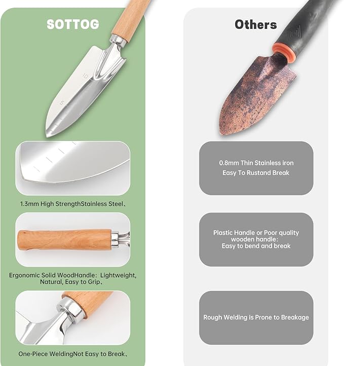 - Heavy-duty gardening tool kit:Is made of high-strength stainless steel, which is sturdy and durable and has extremely strong rust and corrosion resistance. Besides, during use, the tools hardly deform or break and can efficiently deal with any challenges in gardening work.