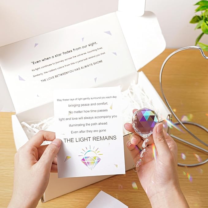 - 【Gift Contents】This premium gift box, filled with white raffia grass for a touch of elegance, includes a 40mm crystal sun catcher adorned with three beads, a 9-inch silver-plated stand with hooks, and a meaningful condolence card. The unboxing experience is designed to feel truly special and ceremonial
