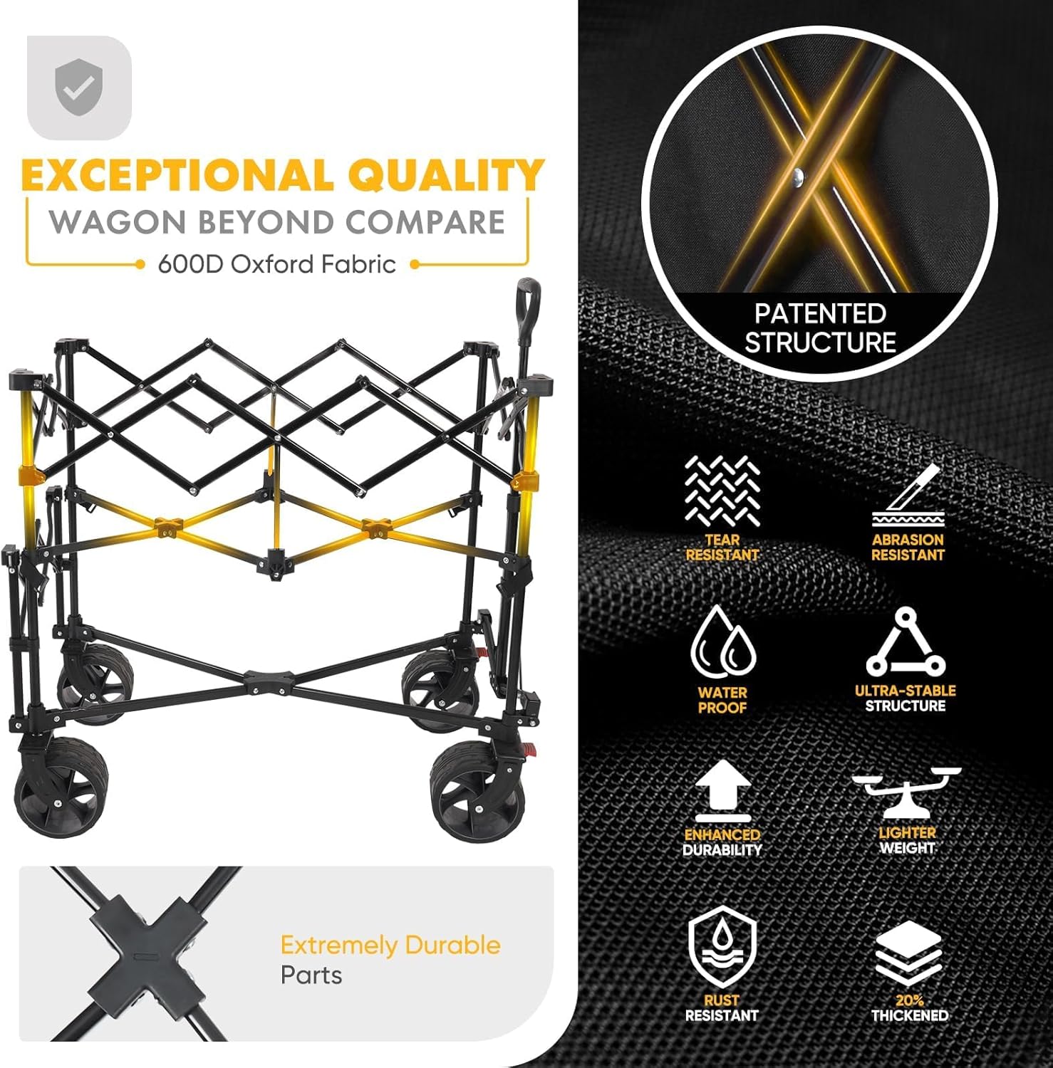 - 𝟓𝟎𝟎𝐋𝐁𝐒 𝐂𝐚𝐩𝐚𝐜𝐢𝐭𝐲: The patented frame structure uses pipes that are 𝟐𝟎% 𝐭𝐡𝐢𝐜𝐤𝐞𝐫 than those of normal wagons, providing enhanced stability and security with a loading capacity of up to 𝟓𝟎𝟎𝐥𝐛𝐬. The 𝟔𝟎𝟎𝐃 𝐎𝐱𝐟𝐨𝐫𝐝 waterproof fabric is tough and won’t tear even with sharp objects inside.