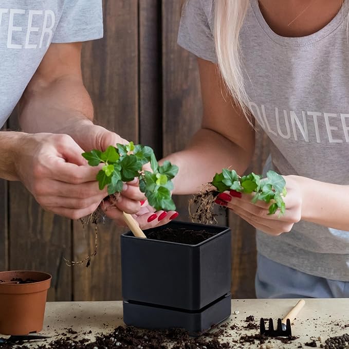 4 Inch Herb Planter Pot, Plastic Planter with Drainage Holes and Saucer, Modern Decorative Gardening Pot for Indoor Plants, Flowers, Herbs, Succulents, Black, Set of 6, 76-Y-B-6
