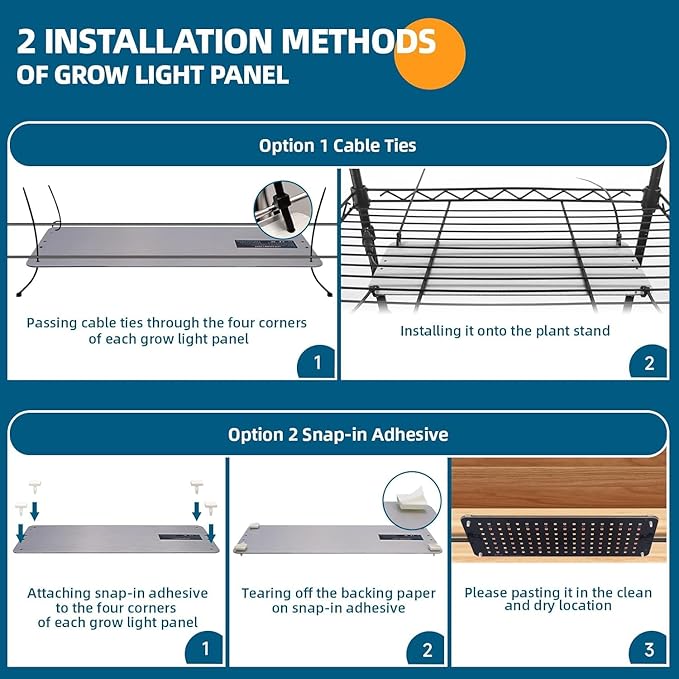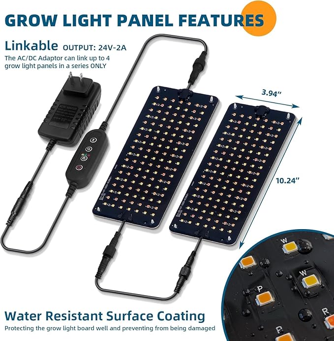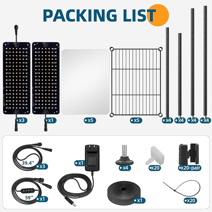 - What You Get: 4 x Barrina Grow Light Panel, 1 x AC/DC Adaptor, 1 x Power Cord with Turn On/Off Timer, 3 x Connecting Cord, 1 x Hook and Loop Tape, 20 x Snap-in Adhesive, 20 x Cable Tie, 5 x wire shelf, 5 x PP pad, 1 x Accessory Kit for Plant Shelf, 1 x Installation Manual