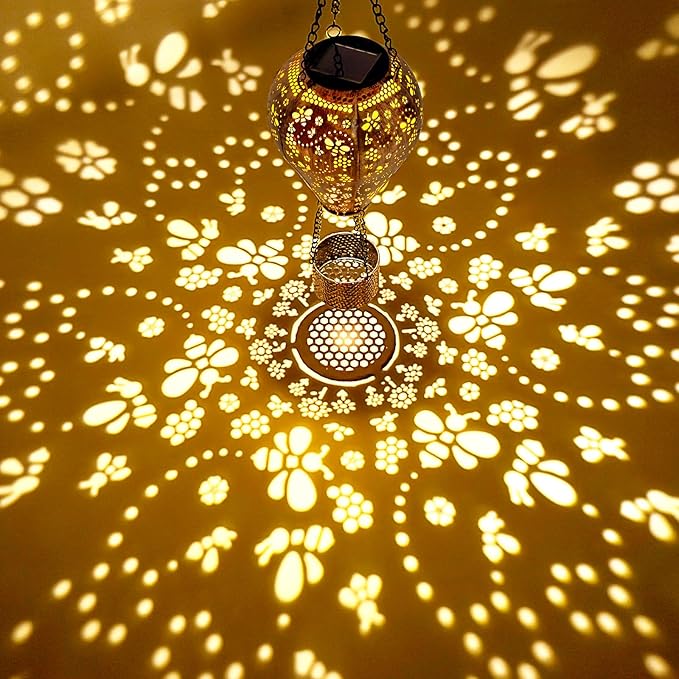 - 【Bee Pattern】The Profinella hot air balloon solar lantern features a unique metal bee cut-out pattern design. During the day, it serves as an art ornament to enhance your garden, yard or outdoor space; at night, it transforms into a magical light show, projecting clear bee patterns onto the ground or walls, adding endless charm to your outdoor decor.