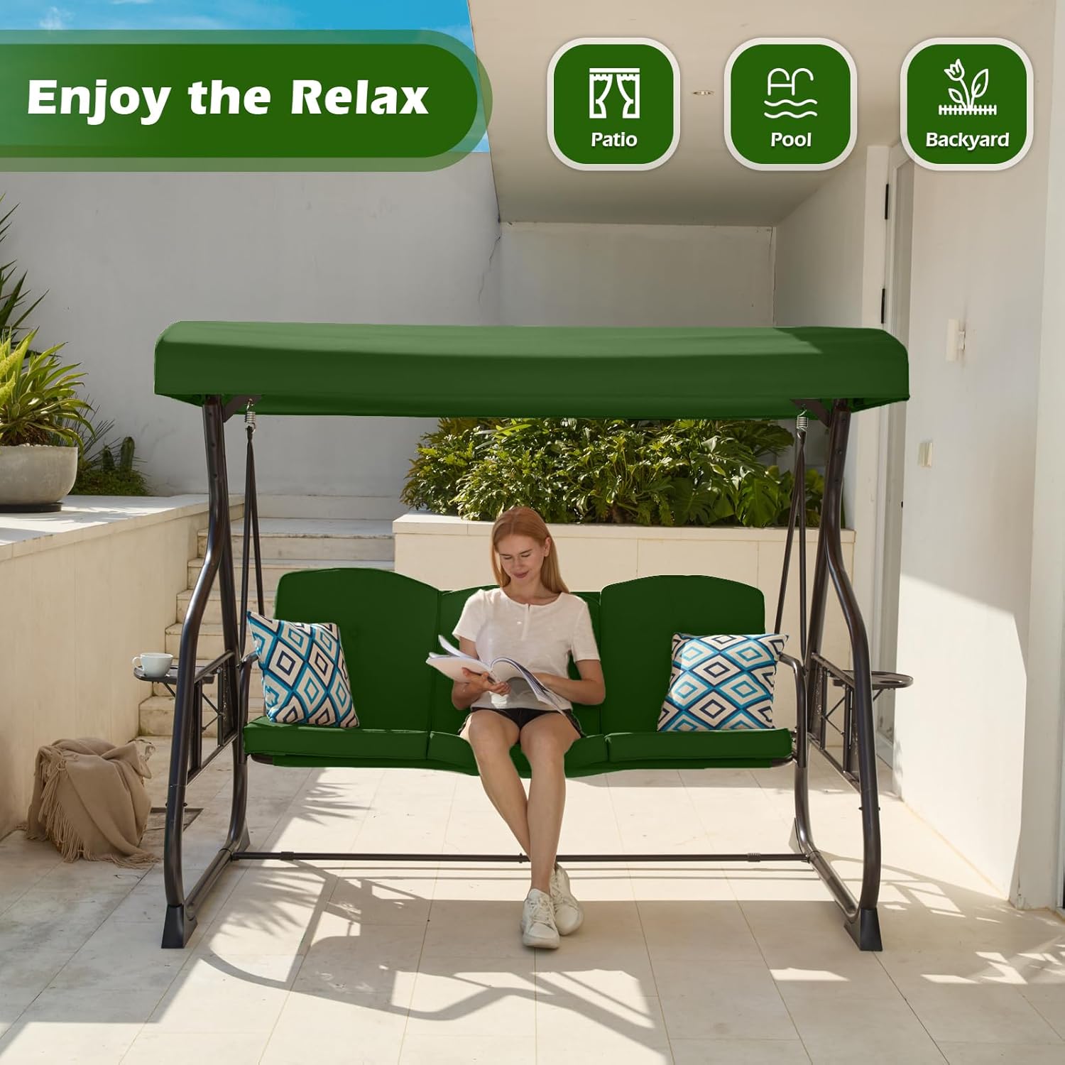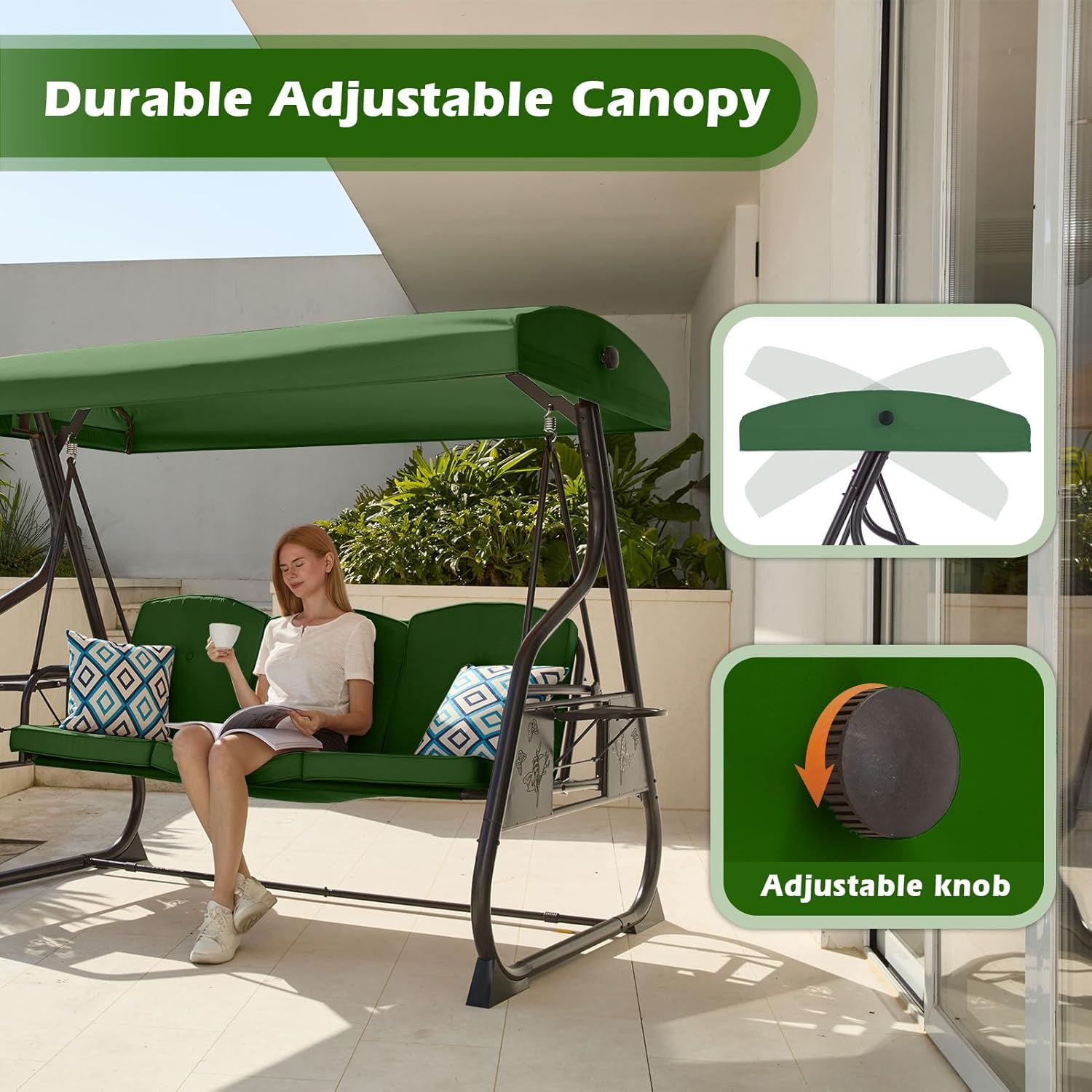 3-Seat Patio Porch Swing 800LBS Outdoor Swing with Stand w/Canopy & Adjustable Backrest Patio Glider Chair w/Removable Pillows & Foldable Side Tray for Balcony Garden Deck (Green)