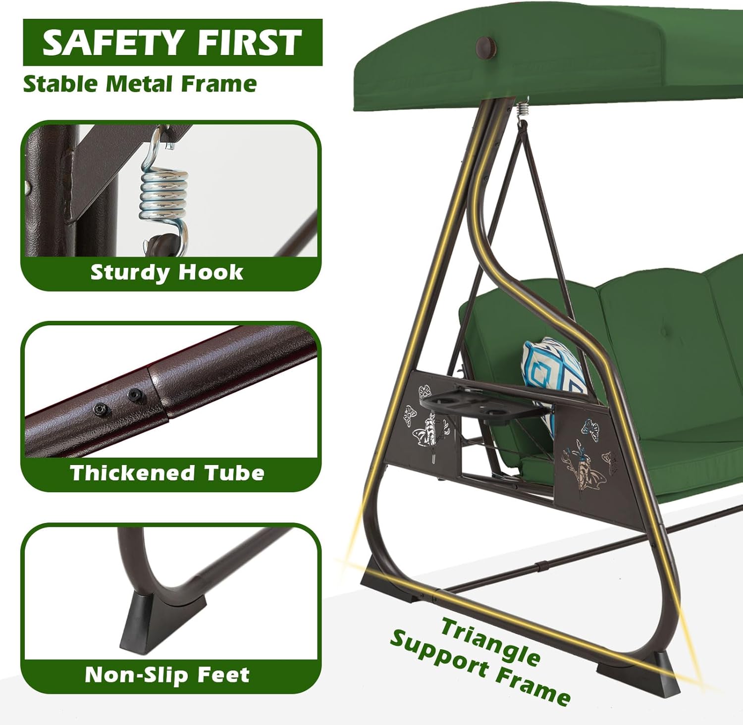 - 【Uncomfortable and slippery cushions?】: We researched lots of glider swing issues about the cushions being uncomfortable and slipping off. So we have thickened the cushions and used high density foam. Non-slip pad as a gift to avoid the cushion slipping off