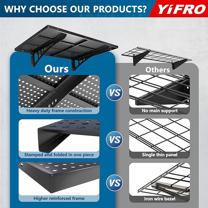 - HEAVY DUTY CONSTRUCTION: YIFRO garage wall shelving takes its cues from architectural frame construction, with a 2x3 ft individual bracket load capacity of 250 lbs. and a total of 500 lbs. for 2 shelves, which makes it easy to store most of the items in your garage.