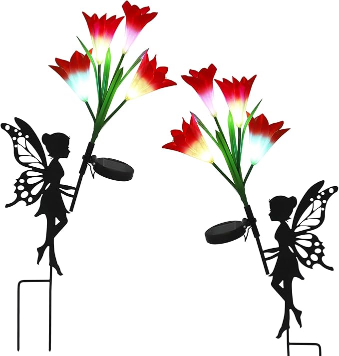 - 2 Pack Unique Solar Outdoor Lights: The solar lights outdoor waterproof exquisitely designed with the cute standing metal fairy statue holds up the imitate real lily flowers. Adjustable flower stems and leaves make you freely design the pose and angle of this solar fairy garden decor for outside as you like, creating a romantic atmosphere for your garden. The solar pathway lights can transform your garden into a dazzling wonderland at night