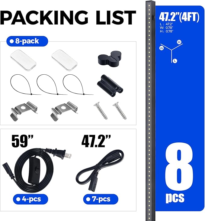 - What You Get: 8 x Barrina T5 Grow Lights, 4 x Power Cords with ON/OFF Switch, 7 x Connecting Cords (47.2''), 8 x Small Connectors, 16 x Installation Clips, 16 x Magnetic Bars with Double-Sided Tape, 24 x Cable Ties, 8 x Dustproof Cap
