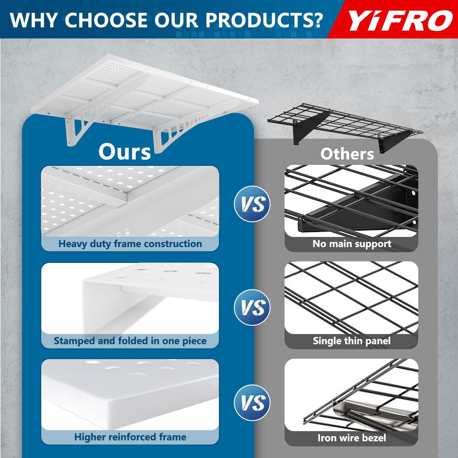 - HEAVY DUTY CONSTRUCTION: YIFRO garage wall shelving takes its cues from architectural frame construction, with a 1.5x4 ft individual bracket load capacity of 250 lbs. and a total of 500 lbs. for 2 shelves, which makes it easy to store most of the items in your garage.
