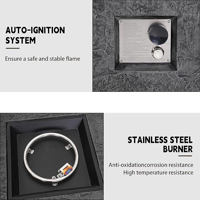 - 🔥 Lightweight Concrete: This outdoor fire table set is constructed of lightweight slate and features a modern imitate the texture of stone. This provides a highly durable structure that can hold a substantial amount of weight.