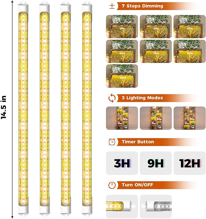 - Plant Shelf with Grow Light: The plant light contains 3 supplemental light modes: 1. 48 leds warm white(3000k), only 3000k high uniform light ,like sunlight improve seeding growth ; 2. 48 leds Red (660nm): promote plant growth , flowering and fruit; 3. Red+ Warm White (380nm-780nm), Provide universal full spectrum which can meet the light conditions your plants need most in different stages.