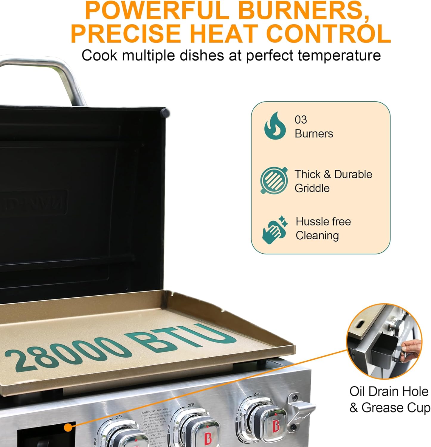 Brand-Man 3-Burner Portable Propane Gas Griddle with Lid - 28,000 BTU Flattop Griddle Grill, 504 Sq. In., Folding Side Tables, Rolling Cart for Outdoor BBQ, Camping, Patio