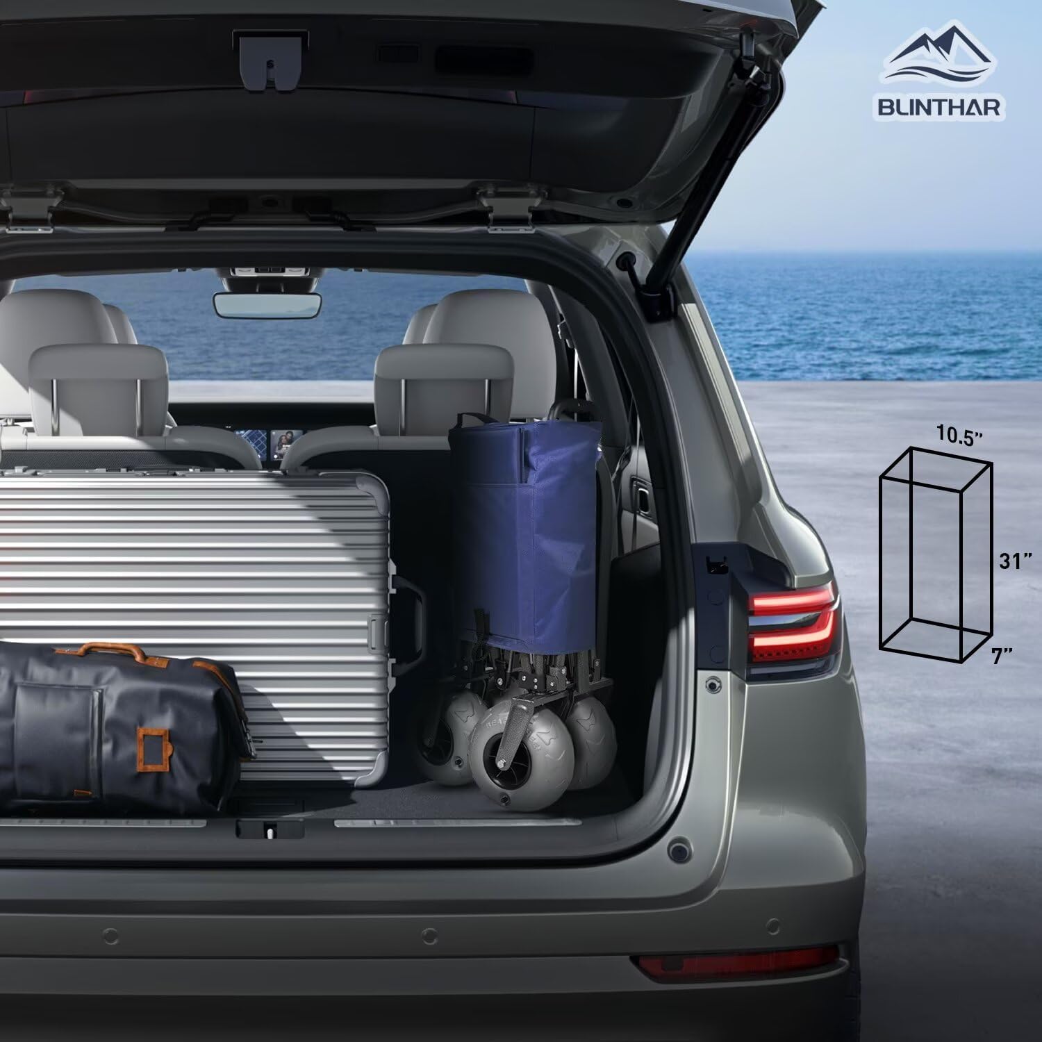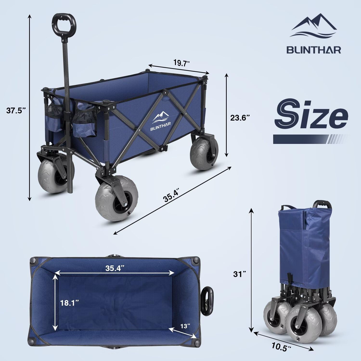 - 【Large Capacity】The BLINTHAR foldable wagon offers an expanded size of 35.4" x 19.7" x 23.6"; Balloon Wheel Size: 9" x 4"; Inner Dimensions: 35.4" x 18.1" x 13". When folded, it measures just 10.5" x 7" x 31", making it easy to fit into any car.Retractable handle telescopes up to a height of 37.5" for pulling comfort and ease of use.