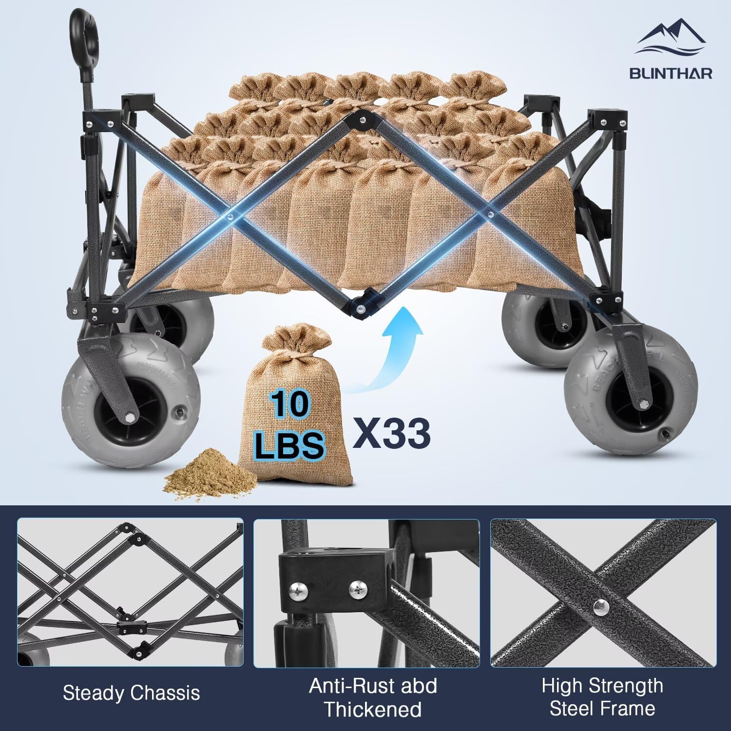 - 【Tough and Reliable Beach Wagon】Built with premium hammered silver steel, the BLINTHAR heavy duty folding wagon features an ultra-durable frame that can support a static weight of up to 330 pounds and a dynamic load of 240 pounds. Two mesh cup holders beverages safe and sound. Just pull the middle strap and watch it collapse in a second.