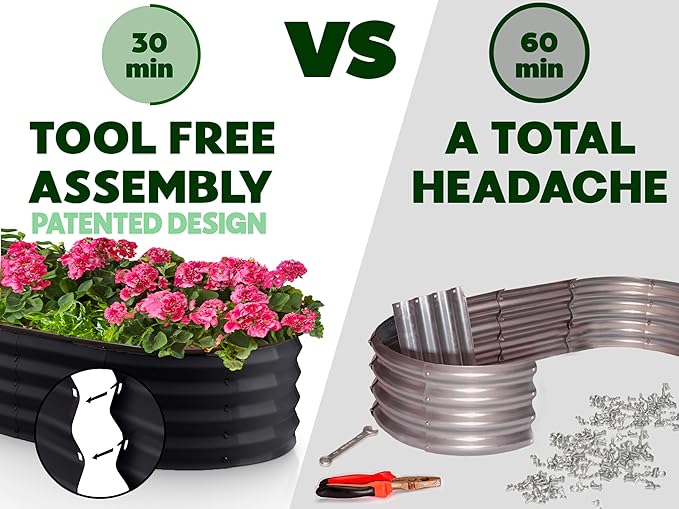 - EFFORTLESS ASSEMBLY, LIKE NO OTHER! Begin your planting journey by choosing our innovative patented design, featuring the perfect combination of easy assembly and durability. Thanks to our unique tool-free design, assembly is a breeze and can be completed in just 30 minutes! Get started on your garden right away and enjoy fresh, healthy produce in no time.