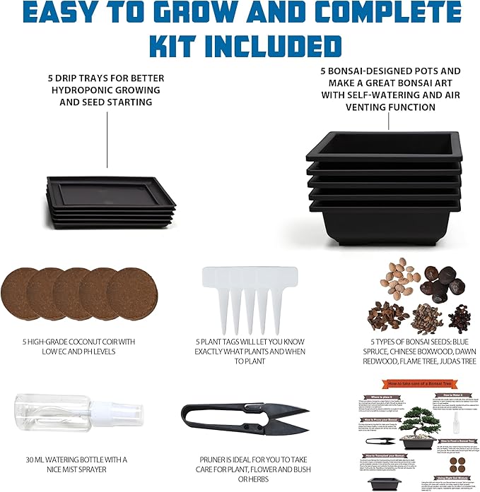 - KIT INCLUDES: 5 types of bonsai tree seeds, 5 plastic pots with drip trays, 5 soil discs, 5 plastic writable plant markers, 1 bonsai pruner, a mini tweezer, a small water bottle and a gardening guide.